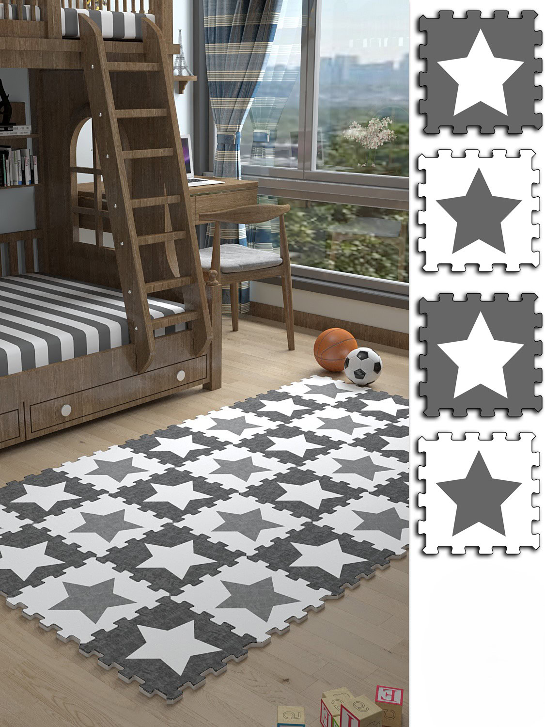 Antrasit-Beyaz Yıldız Baskılı Çocuk Odası Kaymaz Japon Halı