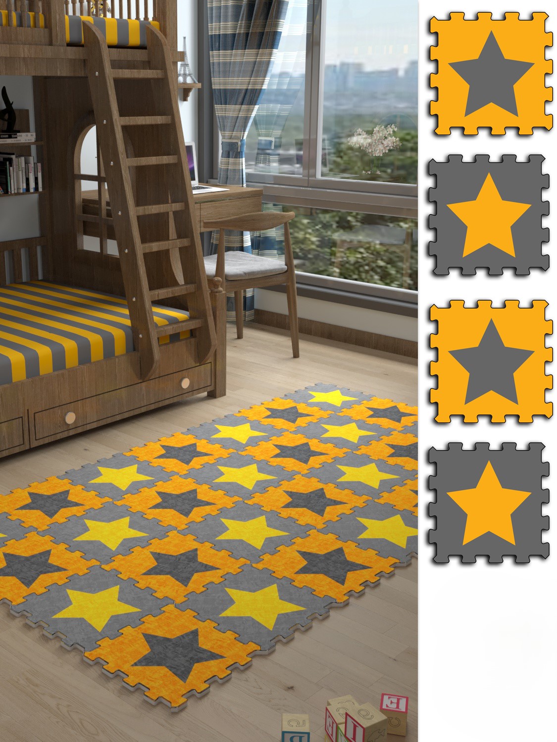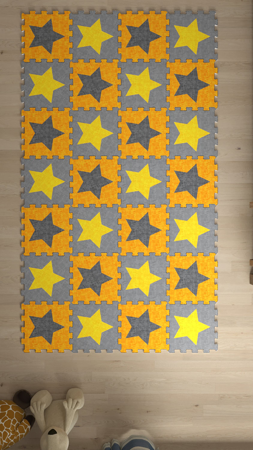 Antrasit-Sarı Yıldız Baskılı Çocuk Odası Kaymaz Japon Halı