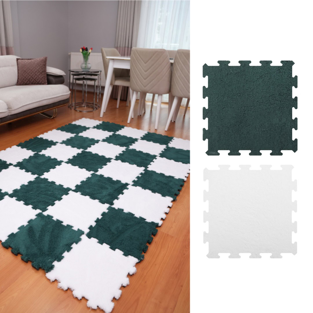 Beyaz Yeşil Peluş Yıkanabilir Yapboz-Puzzle Japon Halı