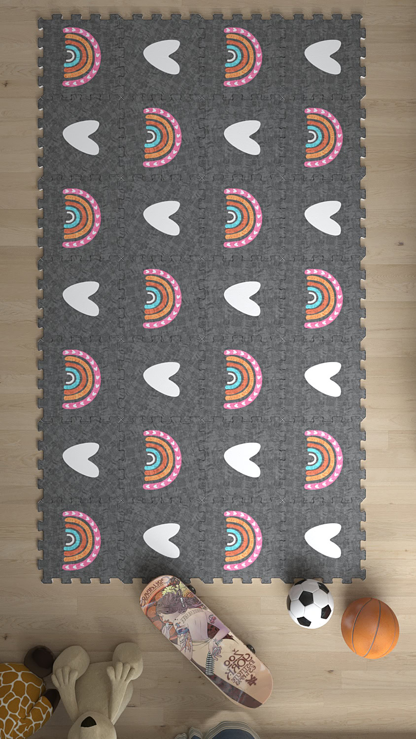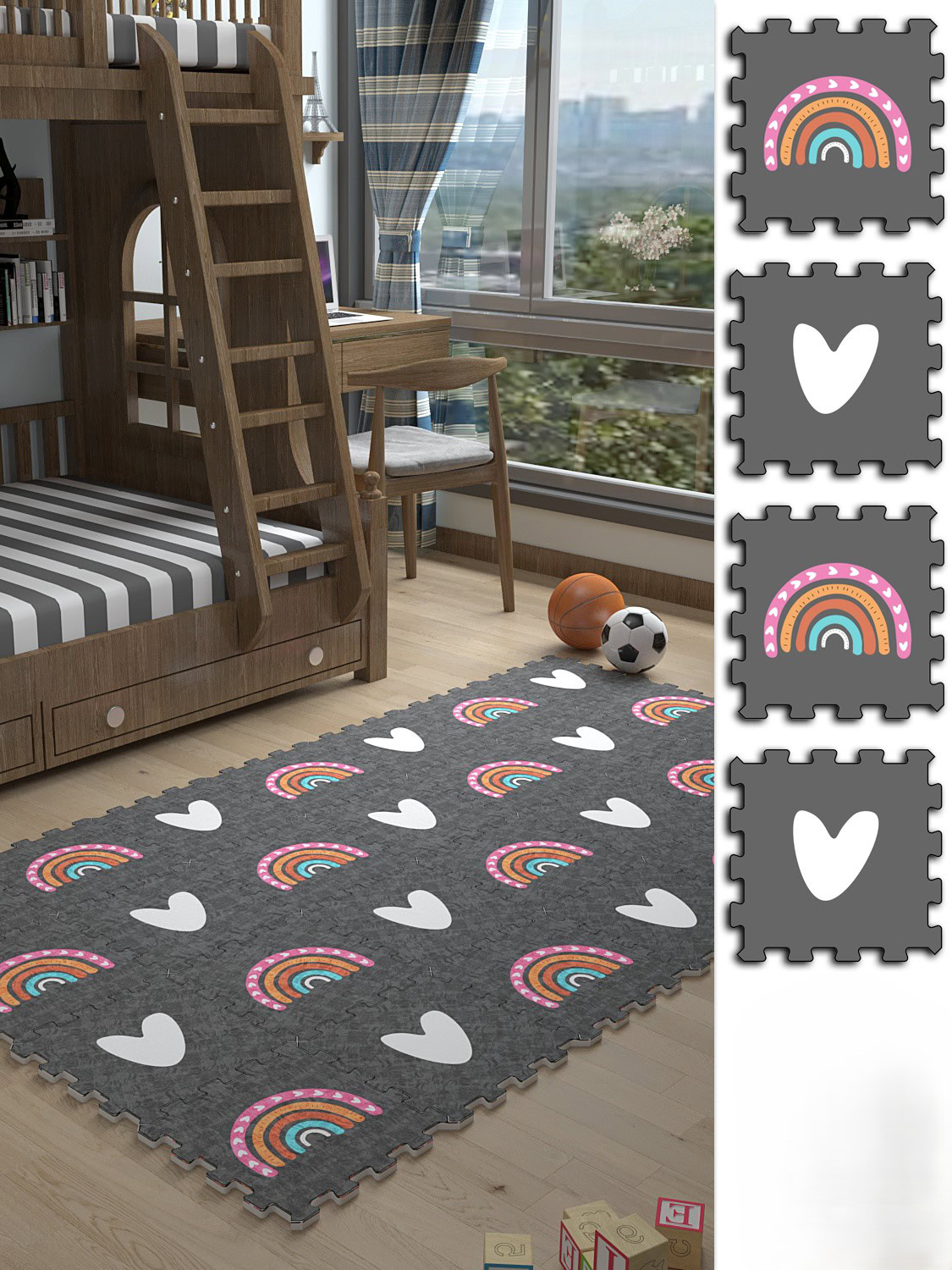 Gökkuşaklı Kalpli Baskılı Çocuk Odası Kaymaz Japon Halı