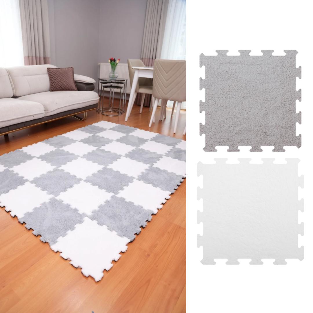 Gri Beyaz Peluş Yıkanabilir Yapboz-Puzzle Japon Halı