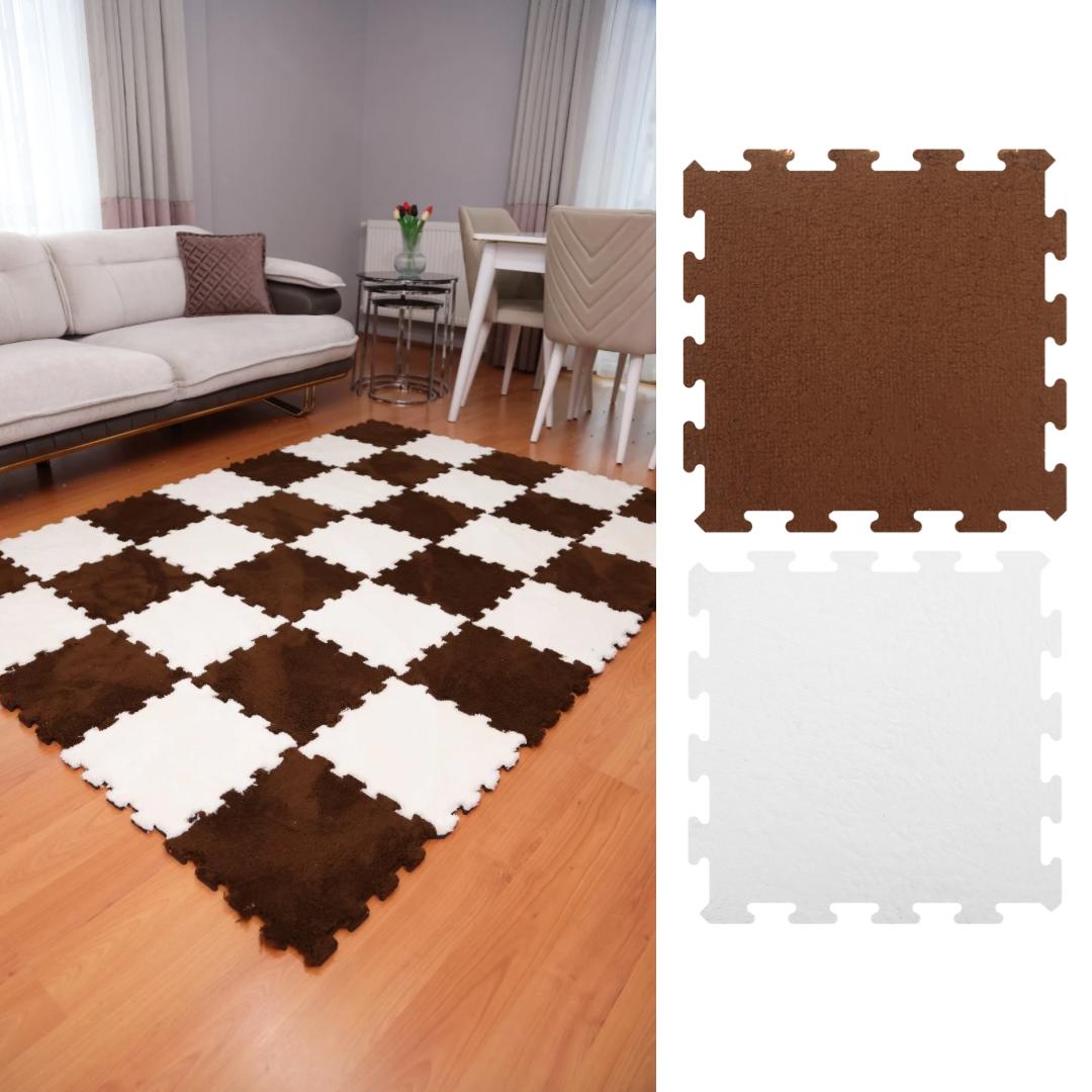 Kahve Beyaz Peluş Yıkanabilir Yapboz-Puzzle Japon Halı
