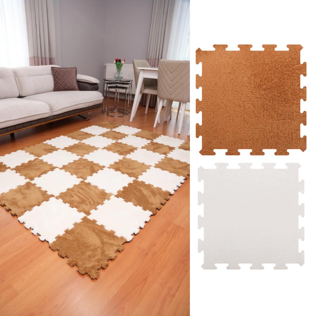 Kahve Beyaz Peluş Yıkanabilir Yapboz-Puzzle Japon Halı