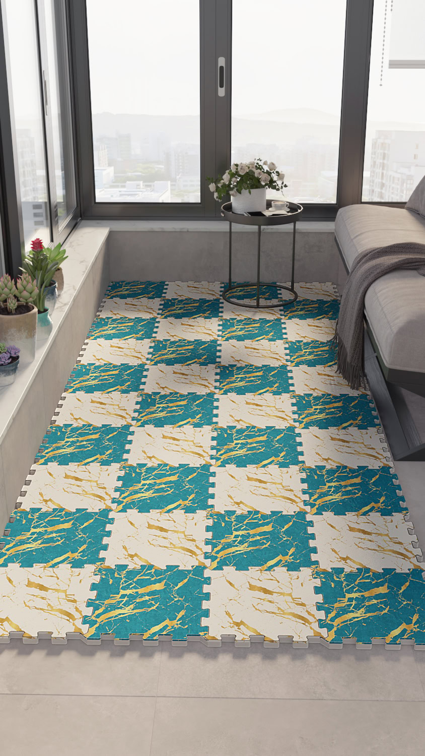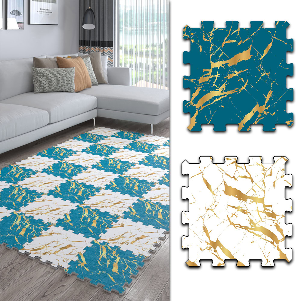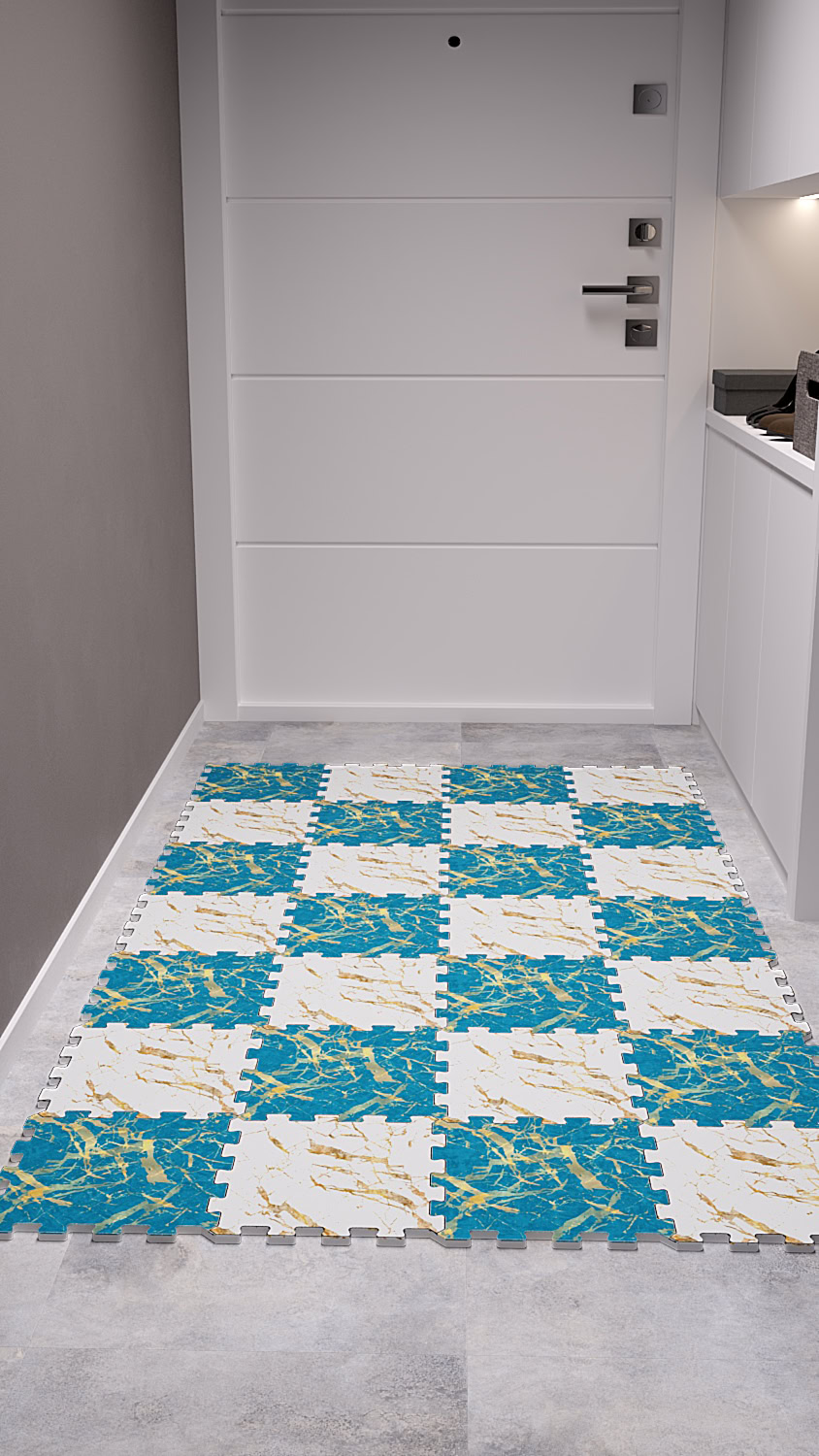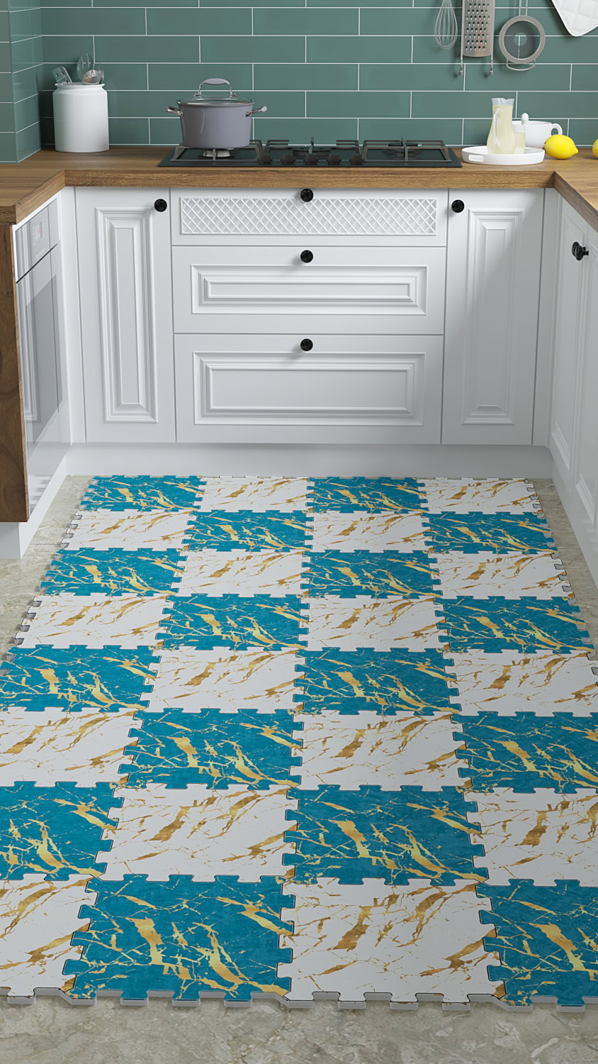Mavi Beyaz Altın Yaldız Desenli Kaymaz Japon Halı