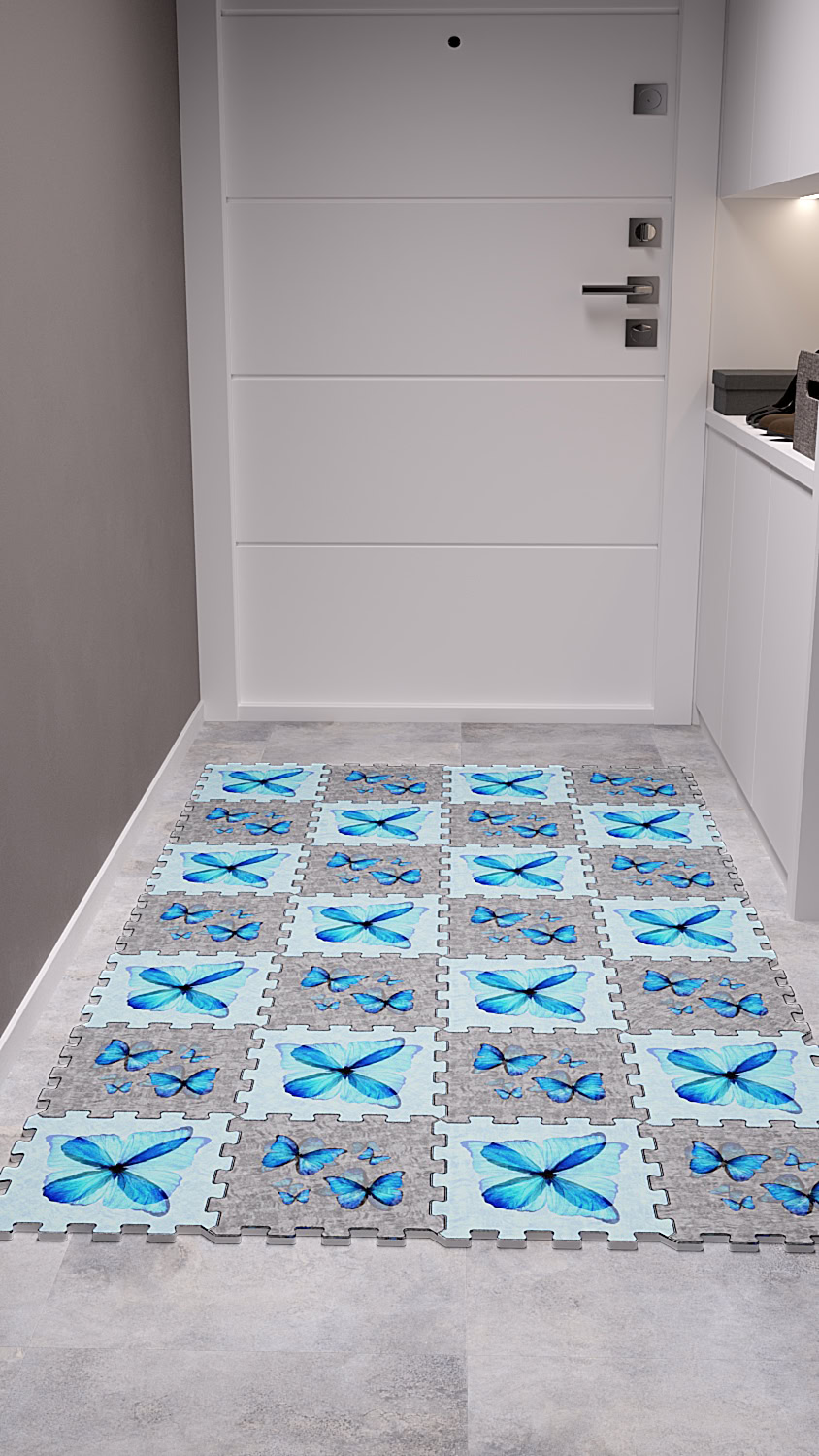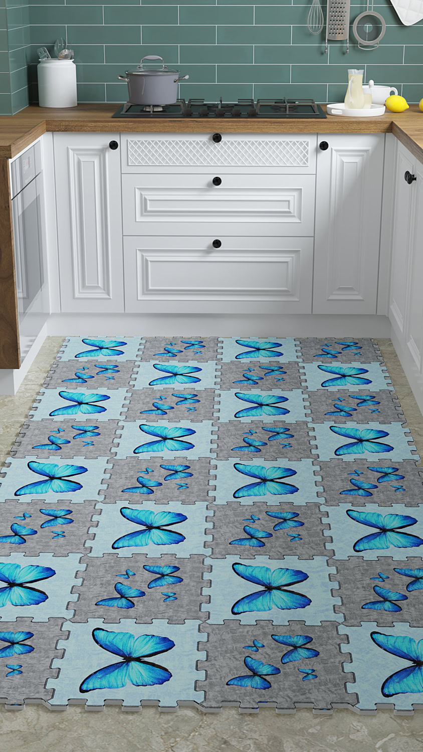Mavi Gri Dijital Kelebek Baskı Desenli Japon Halı