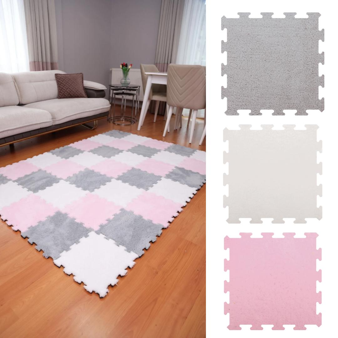 Pembe Gri Beyaz Peluş Yıkanabilir Yapboz-Puzzle Japon Halı