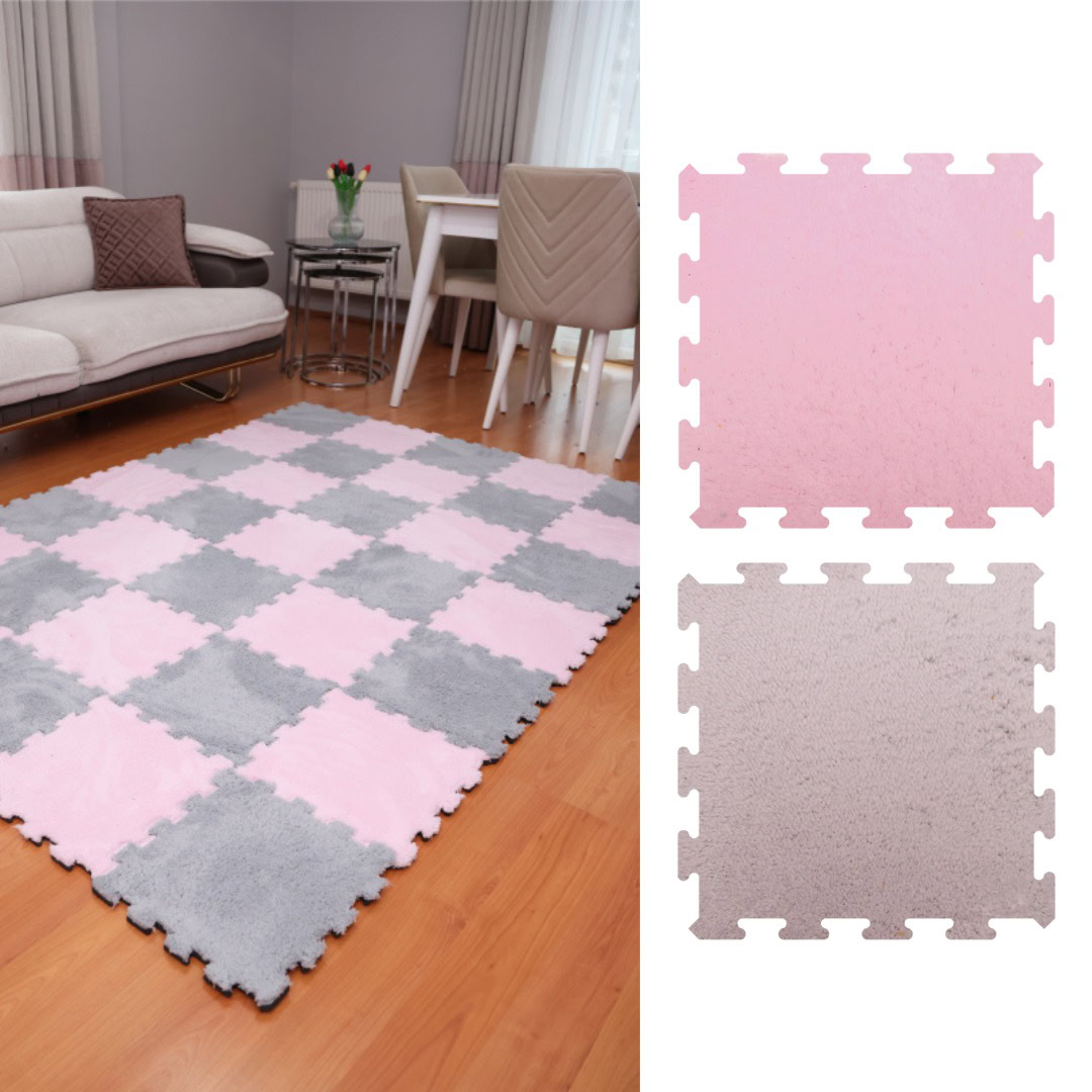 Pembe-Gri Peluş Yıkanabilir Yapboz-Puzzle Japon Halı